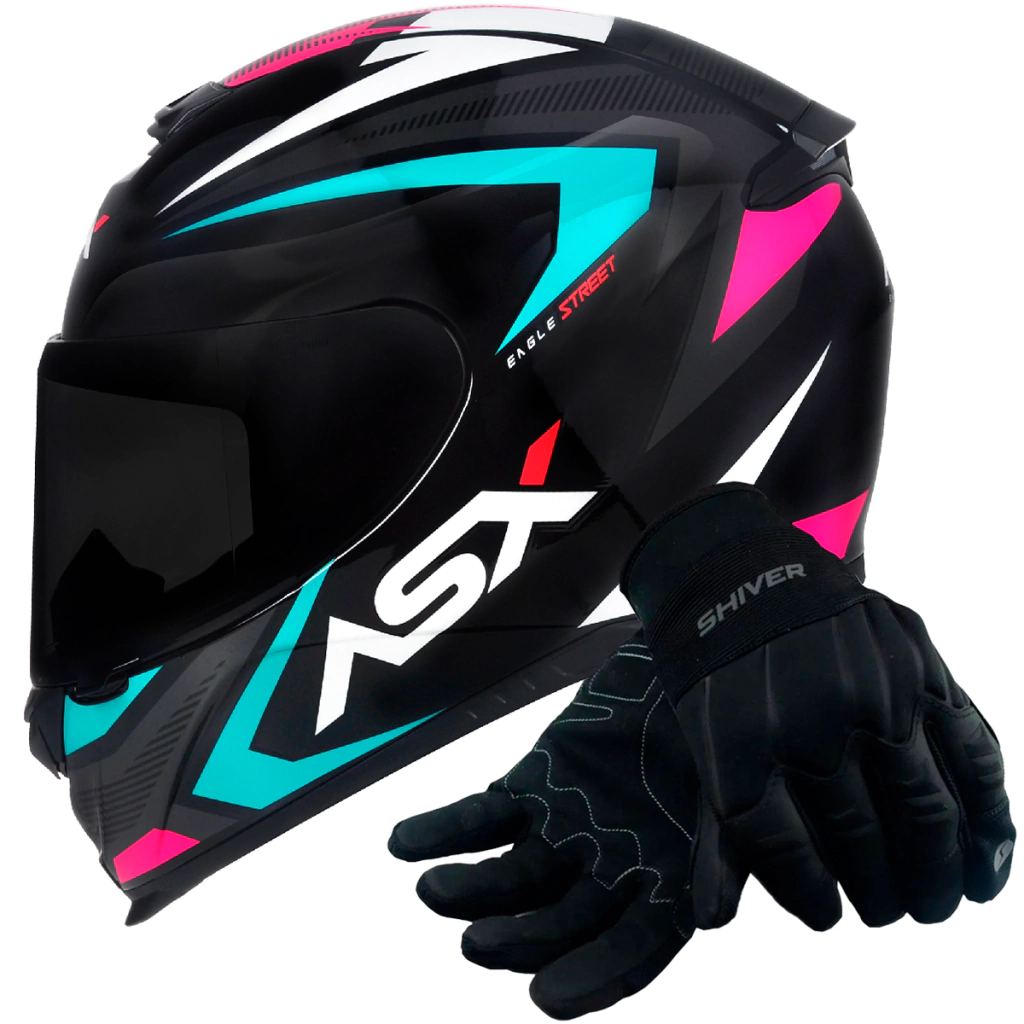 CAPACETE ASX EAGLE STREET BRILHO PRETO/TIFFANY/ROSA + LUVA ROCKET SHIVER