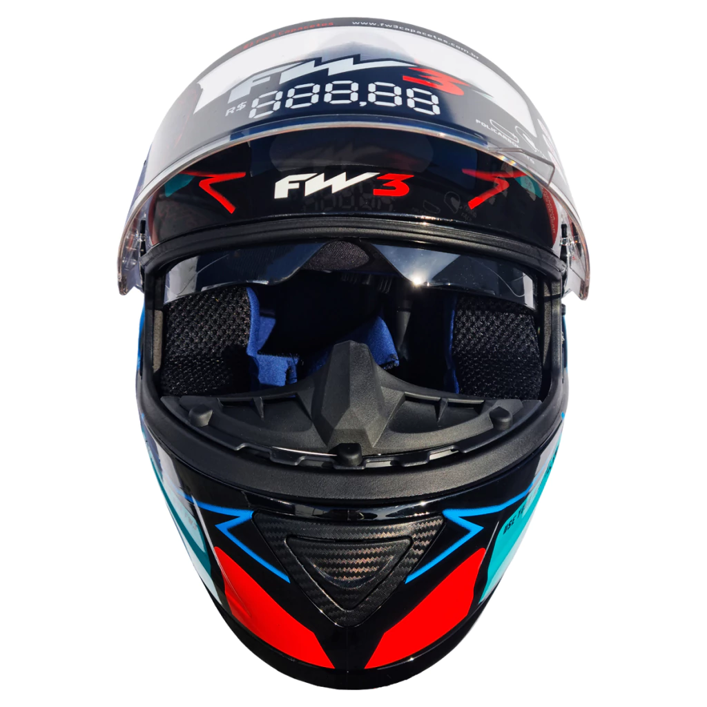 - 01 Capacete FW3 Modelo GTX 43 Azul e Vermelho c/ Óculos Interno.