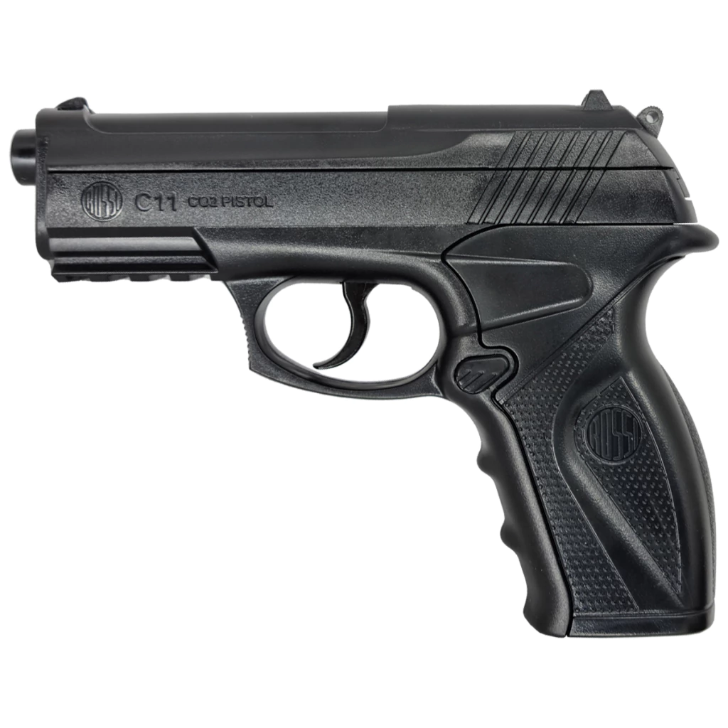 Pistola Rossi C11 é uma pistola de pressão Co2 que utiliza esferas de aço 4,5mm como munição. Seu sistema de propulsão é por cilindro co2 12g com sistema de fácil recarga pela empunhadura, miras fixas com ponto branco na frontal, trava e gatilho manual, também possui trilho para inserção de lanterna. Fabricada em polímero, tem alta resistência e força, pistola muito realista e semelhantes a modelos de arma de fogo.